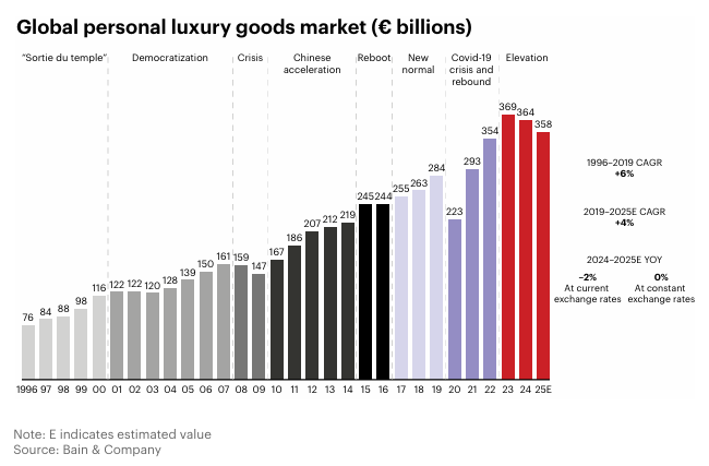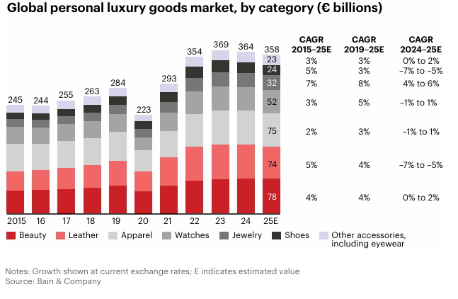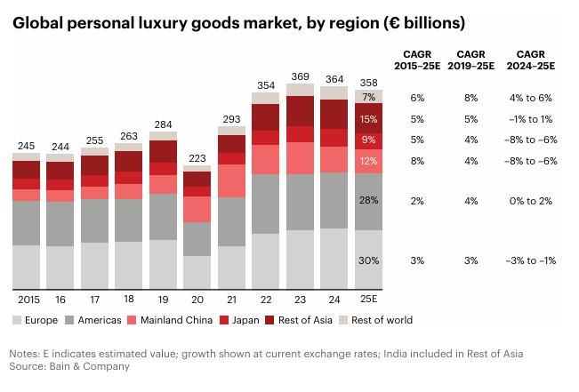 Despite macroeconomic uncertainty and high prices, the personal luxury goods segment, at the heart of the luxury industry, remained relatively stable, with total sales expected to reach €358 billion in 2025. This reflects a slight decline of 2% at current exchange rates and flat performance at constant exchange rates.
