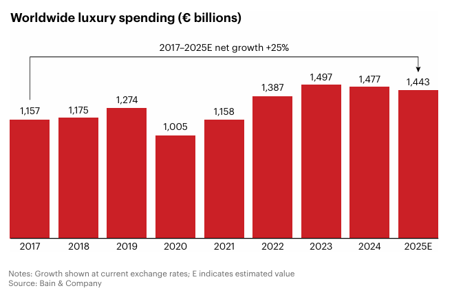 Global luxury spending is expected to reach €1.44 trillion in 2025, representing a slight decline of 1%-3% at current exchange rates relative to 2024, or a range of -1%-+1% at constant exchange rates.