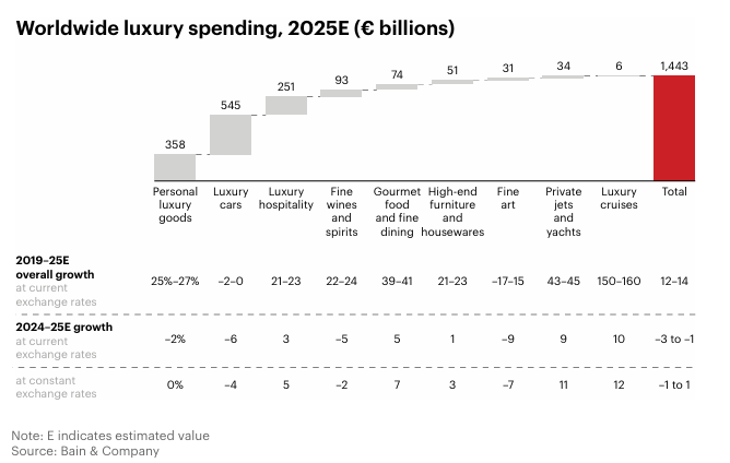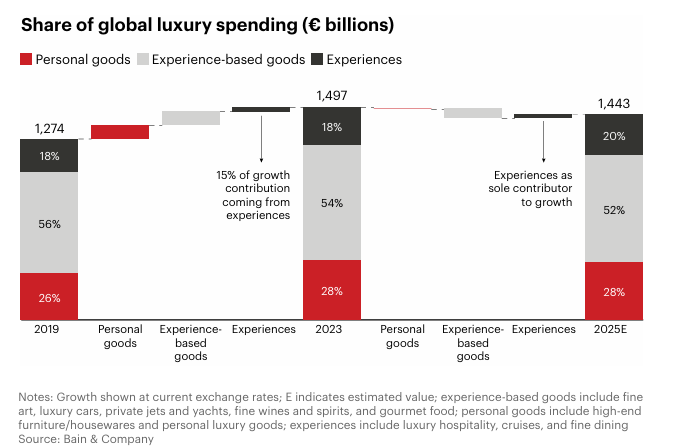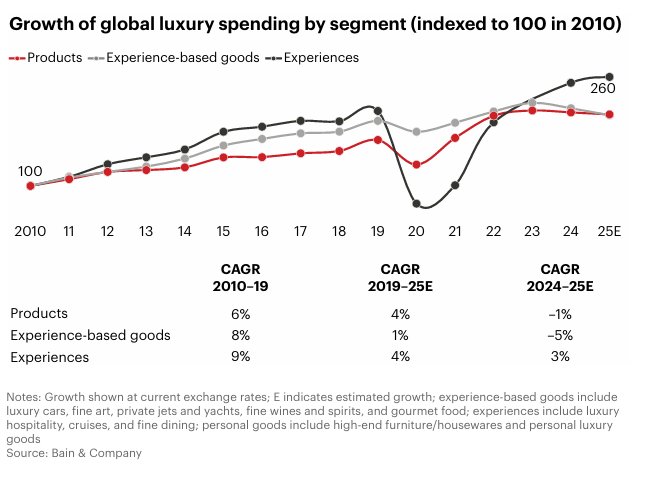 Consumer spending continues to shift from tangible goods to experiences such as luxury hospitality, cruises, and fine dining. Since 2023, experiential categories have become the primary contributors to luxury market growth.