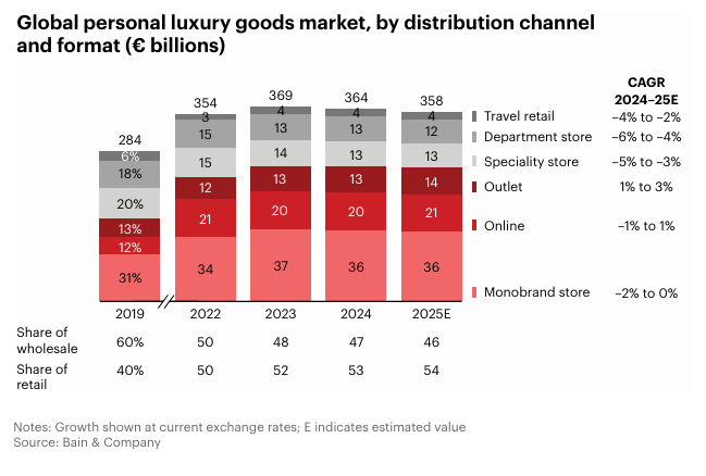 Outlets were the only physical retail format to maintain growth (1%–3%), reflecting consumers’ pursuit of value. Other offline channels—including travel retail, department stores, and brand boutiques—saw declining trends.