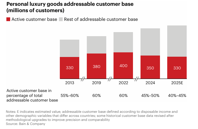 Around 20 million consumers exited the market in 2025, reducing the global active customer base to approximately 330 million. This was largely due to “aspirational” consumers withdrawing or shifting to the secondhand market amid rising prices, economic uncertainty, and waning sentiment.