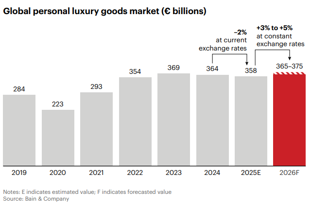 Bain forecasts the luxury market will resume moderate growth of 3% to 5% in 2026.
