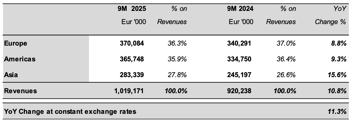 Revenue growth was recorded across all regions, both for the first nine months of the year and in the third quarter. Third-quarter total revenue rose 14.4% year-on-year to €210 million.