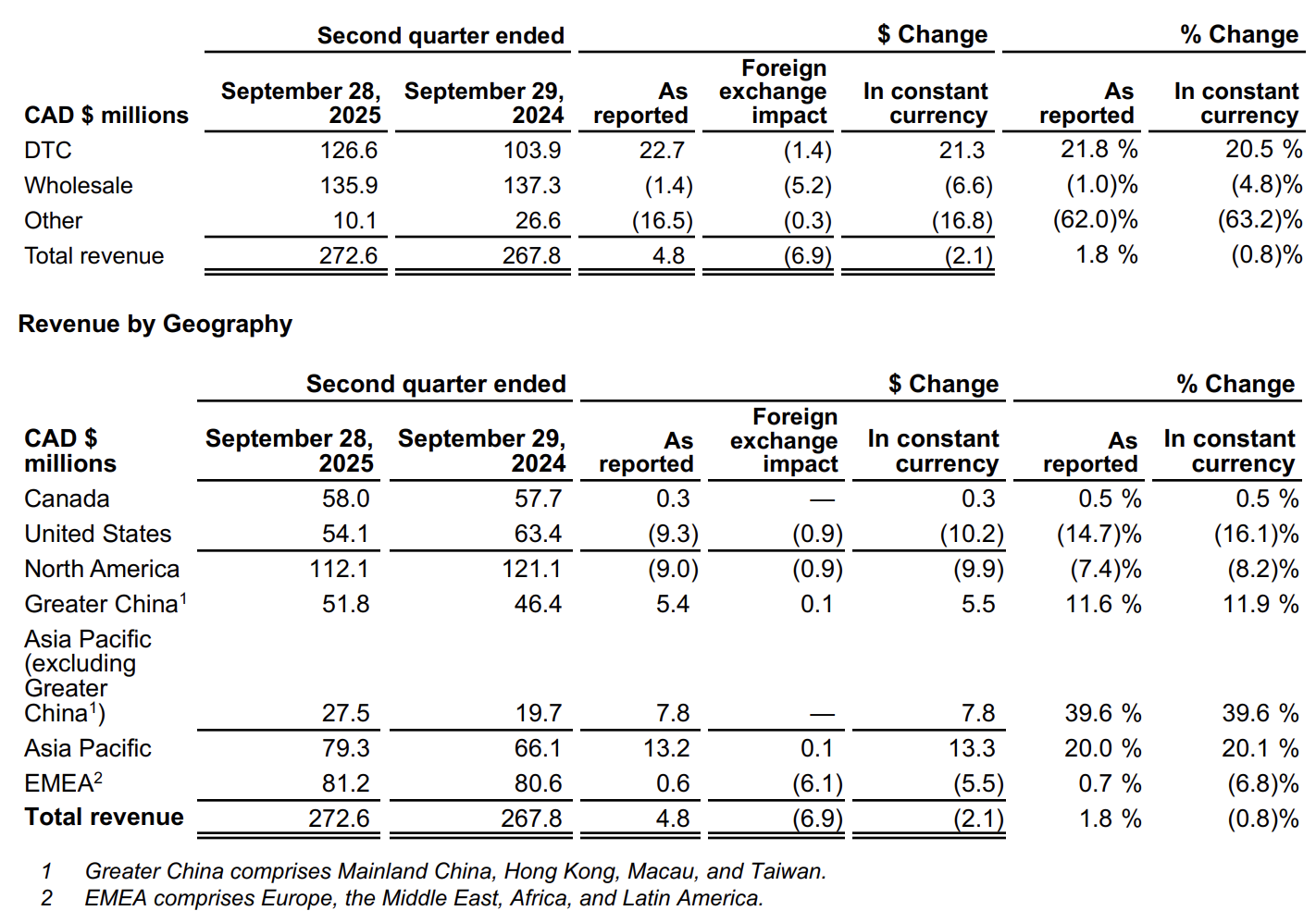 Dani Reiss, Chairman and CEO of Canada Goose, commented, “Our second quarter results reflect strong DTC performance and positive comparable sales growth – clear proof our strategy is working. We’re exactly where we planned to be, investing with intention, elevating our product offering, brand and consumer experiences, and entering peak season with confidence.“