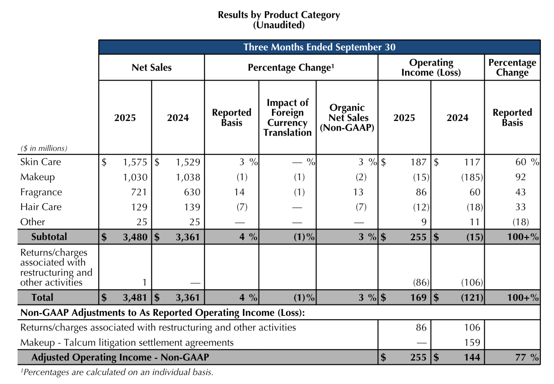 Makeup operating profit improved, primarily due to the absence of a one-time USD 159 million charge in the prior-year period related to the talc litigation settlement, which created a favorable year-over-year comparison.