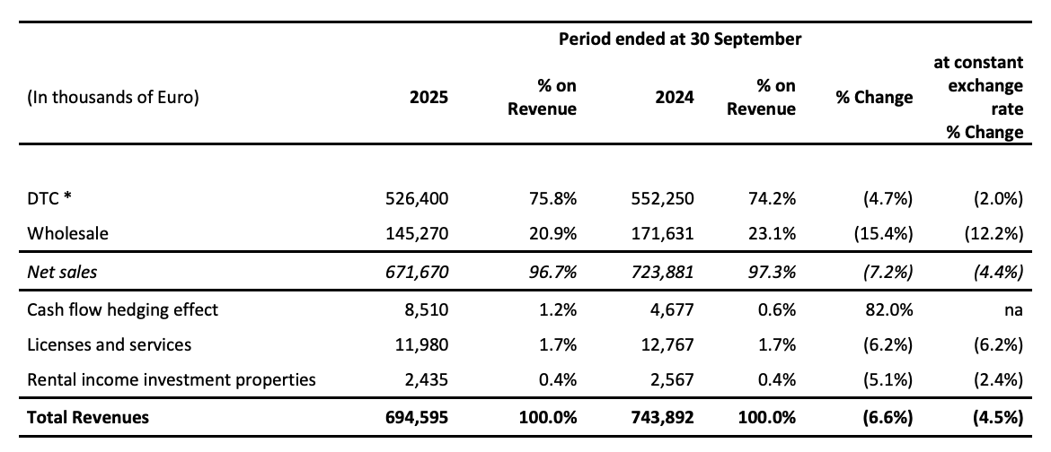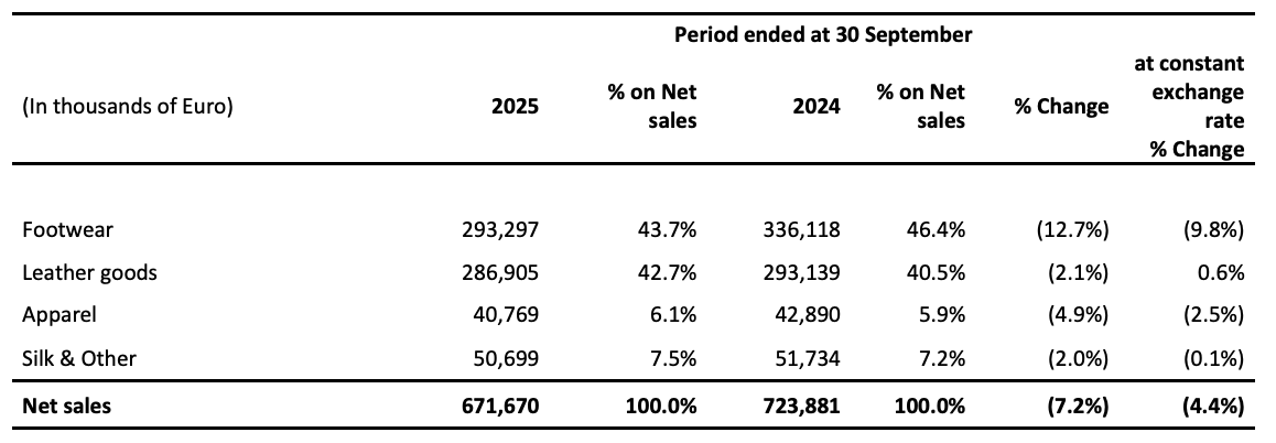For the first nine months of 2025, Ferragamo Group reported total revenue of €695 million, a 4.5% decline year-on-year at constant exchange rates and a 6.6% decline at current exchange rates.