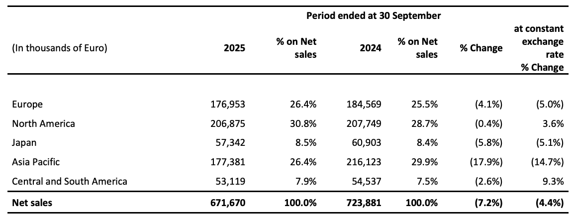 Asia-Pacific: Net revenue declined 10.5% year-on-year at constant exchange rates in Q3, but performance showed quarter-on-quarter improvement from Q2. The DTC channel was the key driver, with the rate of decline narrowing to low single digits.