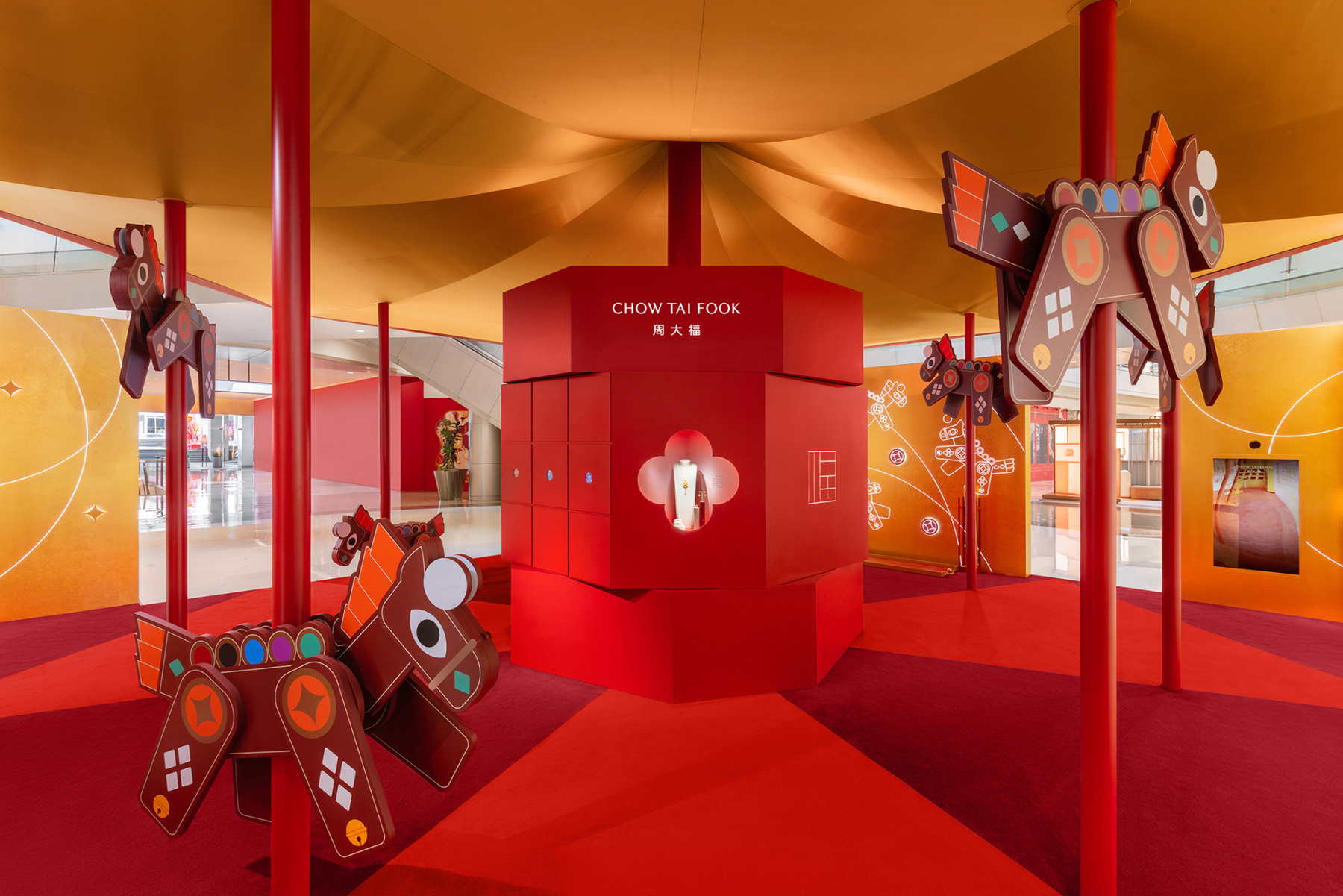 Inspired by the traditional lantern art of the “revolving lantern”, the “Ma Dao Fu Lai” festive garden fair features a central pavilion equipped with a “Thousand-Flower Mirror” and a “Fu Ma Viewing Box”. Guests can experience Chow Tai Fook’s jewellery craftsmanship through playful interactions. Four traditional Song- and Yuan-dynasty street games, paper toys, guanpu, cuju-like ball games, and funhouse mirrors are creatively transformed into lucky, interactive installations that deliver auspicious wishes to participants.