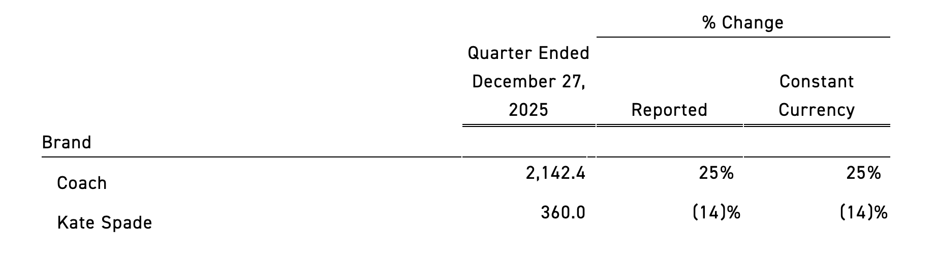 - Across core markets, growth exceeded expectations, with particularly strong constant-currency increases in North America (+17%), Europe (+22%) and Asia-Pacific (+18%) (including Greater China at +34%), driving 25% growth for the Coach brand during the quarter;