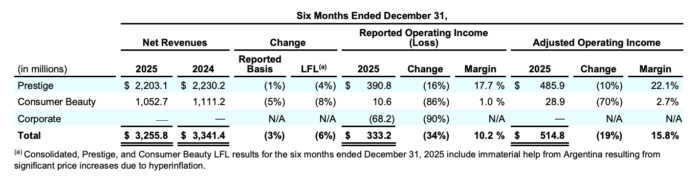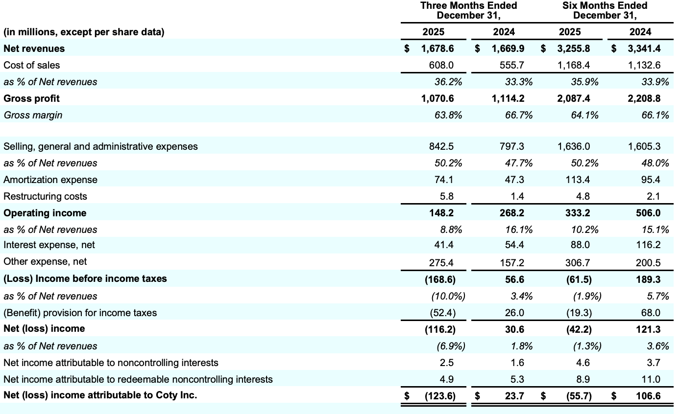 On February 5, international fragrance and beauty group Coty announced its results for the second quarter of fiscal year 2026, ended December 31, 2025: net revenues reached USD 1.678 billion, up 1% year-on-year. The company reported a net loss of USD 126.9 million, compared with net income of USD 20.4 million in the same period last year. Adjusted earnings per share were USD 0.14, up from USD 0.11 in the prior-year period.