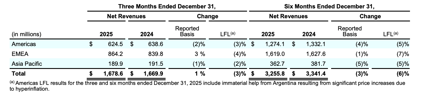 In the second quarter of fiscal 2026, net revenues in the Asia Pacific region, which includes the Chinese Mainland, totalled USD 189.9 million, down 1% on a reported basis. The decline was primarily driven by contraction in Southeast Asia, partially offset by growth in the Chinese Mainland (including Hainan) and Japan. Beauty market trends in the Chinese Mainland have shown gradual improvement, and as penetration increases, fragrances are outperforming other beauty categories.