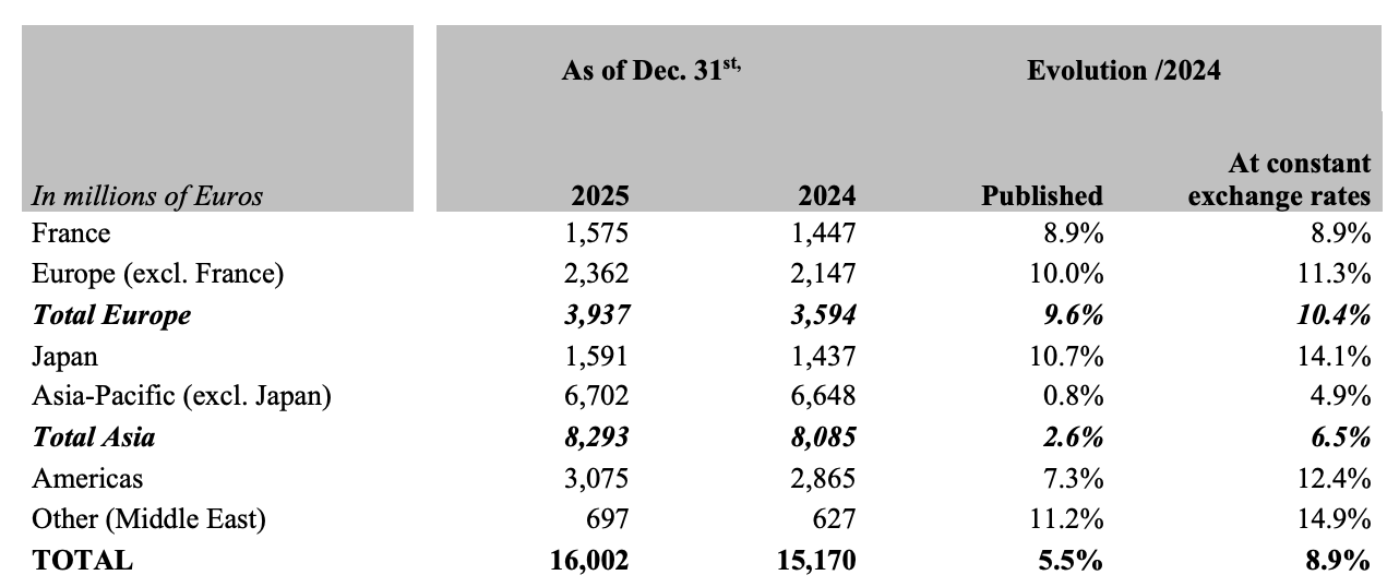 - Europe (excluding France) (+11.3%) and France (+8.9%) achieved solid growth, supported by the loyalty of local customers and dynamic tourist flows. The Florence store in Italy reopened in February following renovation and expansion, followed by the reopening of the Knokke store in Belgium in November.
