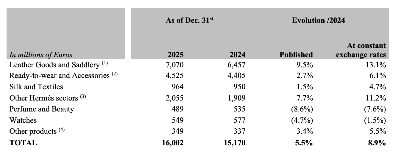 - Ready-to-Wear and Accessories (+6.1%) confirmed its strong momentum. The Spring/Summer 2026 men’s and women’s ready-to-wear collections, presented in June at the Palais d’Iéna and in early October at the Garde Républicaine headquarters, respectively, were warmly received. The latest Autumn/Winter 2026 men’s ready-to-wear collection, designed by Véronique Nichanian, Artistic Director of the Hermès men’s universe for 37 years, was unveiled at the end of January 2026 at the Palais Brongniart.