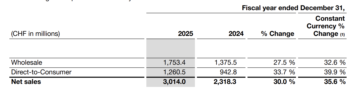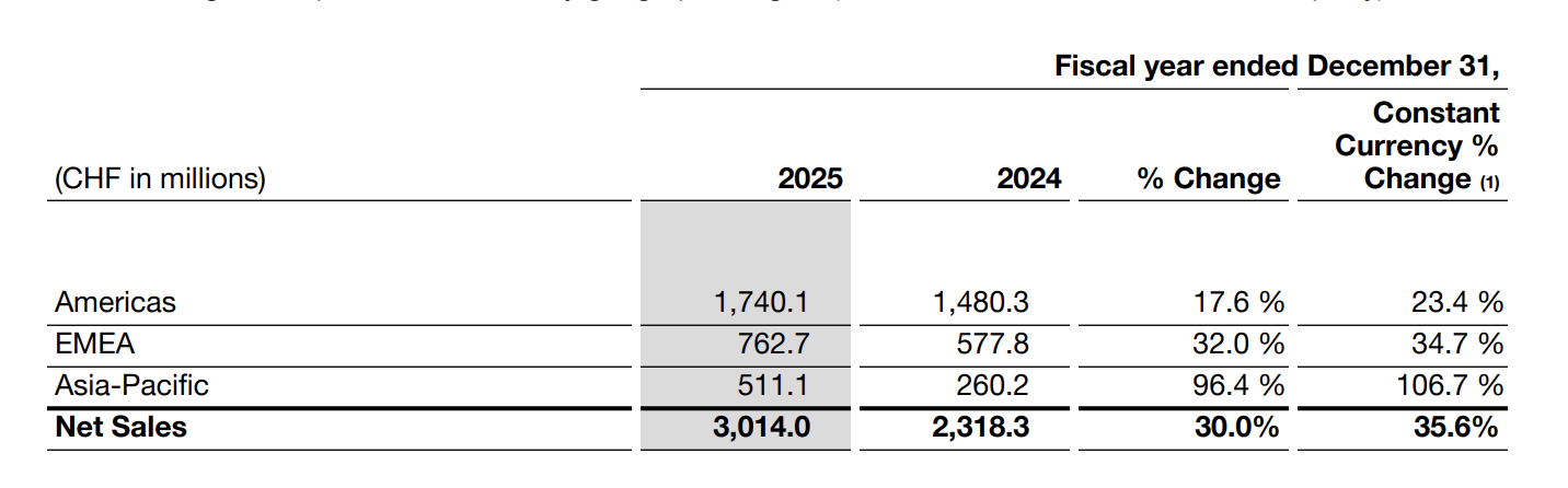 For the full year, net sales surpassed CHF 3 billion for the first time, rising 30.0% year-on-year to CHF 3.014 billion (up 35.6% at constant currency). In the fourth quarter alone, net sales reached CHF 743.8 million, representing a 22.6% year-on-year increase (up 30.6% at constant currency).