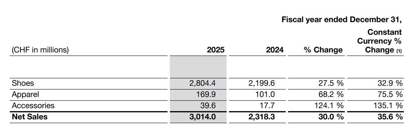 • Full-category evolution: Apparel and accessories together accounted for 7.0% of net sales, up 190 basis points year-on-year, reinforcing On’s evolution into a true head-to-toe, multi-category brand.