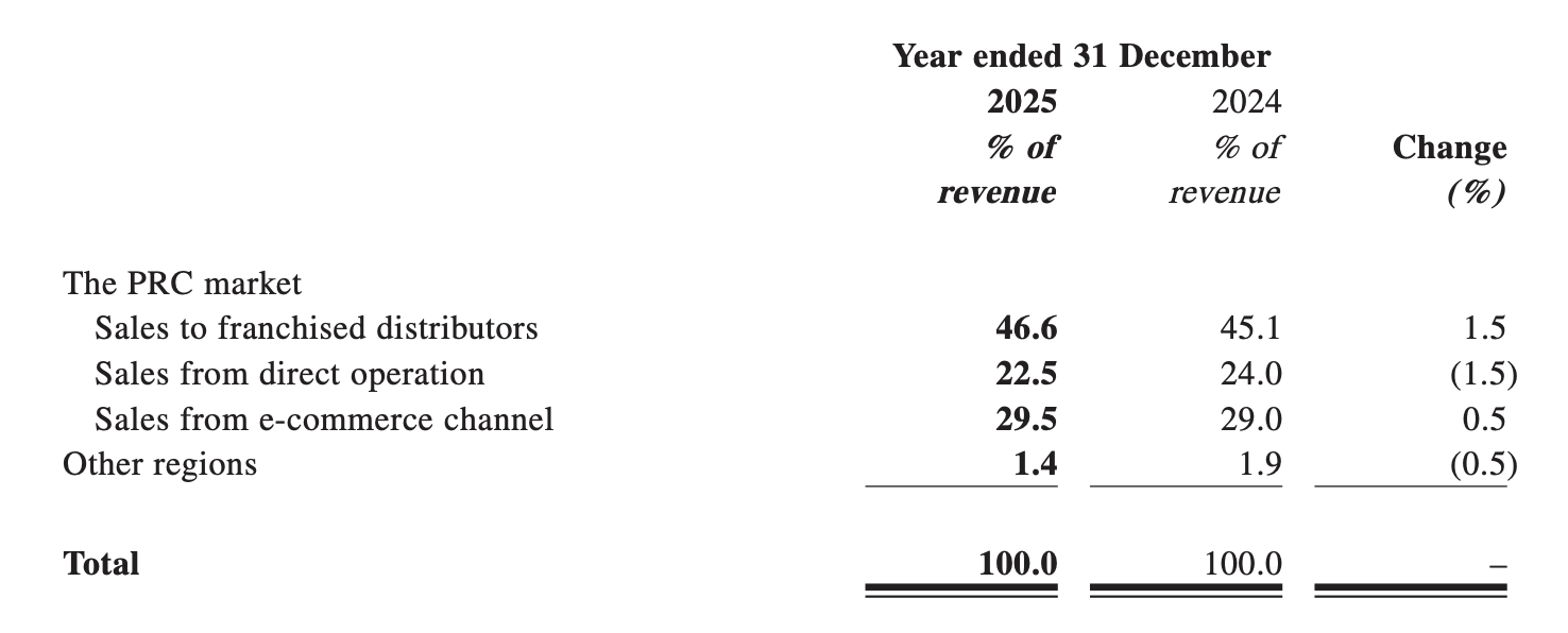 - Wholesale (sales to franchised distributors): Revenue recorded steady growth, up 3% year-on-year to RMB 13.773 billion (approximately USD 1.91 billion), with its contribution rising to 46.6%.