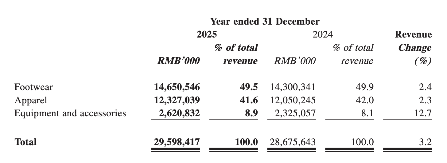 - Footwear: Revenue increased by 2.4% year-on-year to RMB 14.651 billion (approximately USD 2.04 billion), accounting for 49.5% of total revenue, down from 49.9%.