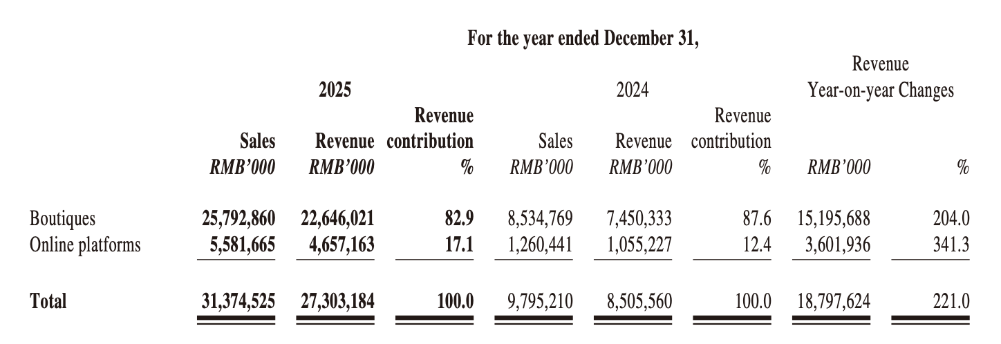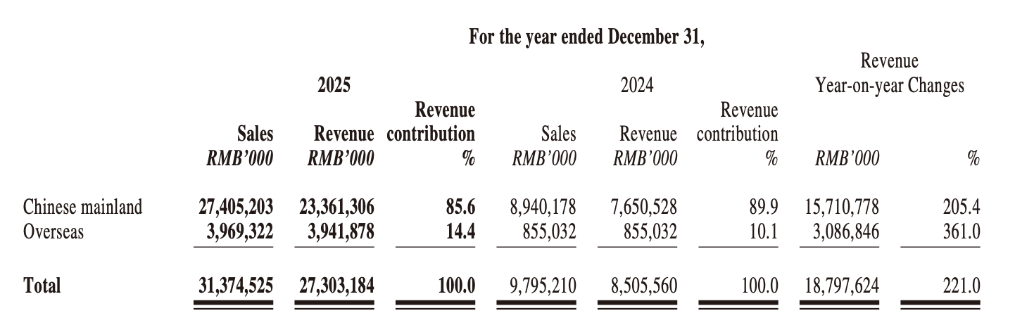 Revenue from the Chinese Mainland reached RMB 23.361 billion (USD 3.25 billion), accounting for 85.6% of total revenue and increasing 205.4% year-on-year. Benefiting from continued overseas channel expansion and the growing global influence of the brand, overseas revenue surged by approximately 361.0% year-on-year to RMB 3.942 billion (USD 548 million) in 2025, raising its contribution to 14.4% of total revenue, in line with the Group’s strategic objective of brand internationalisation and market globalisation.