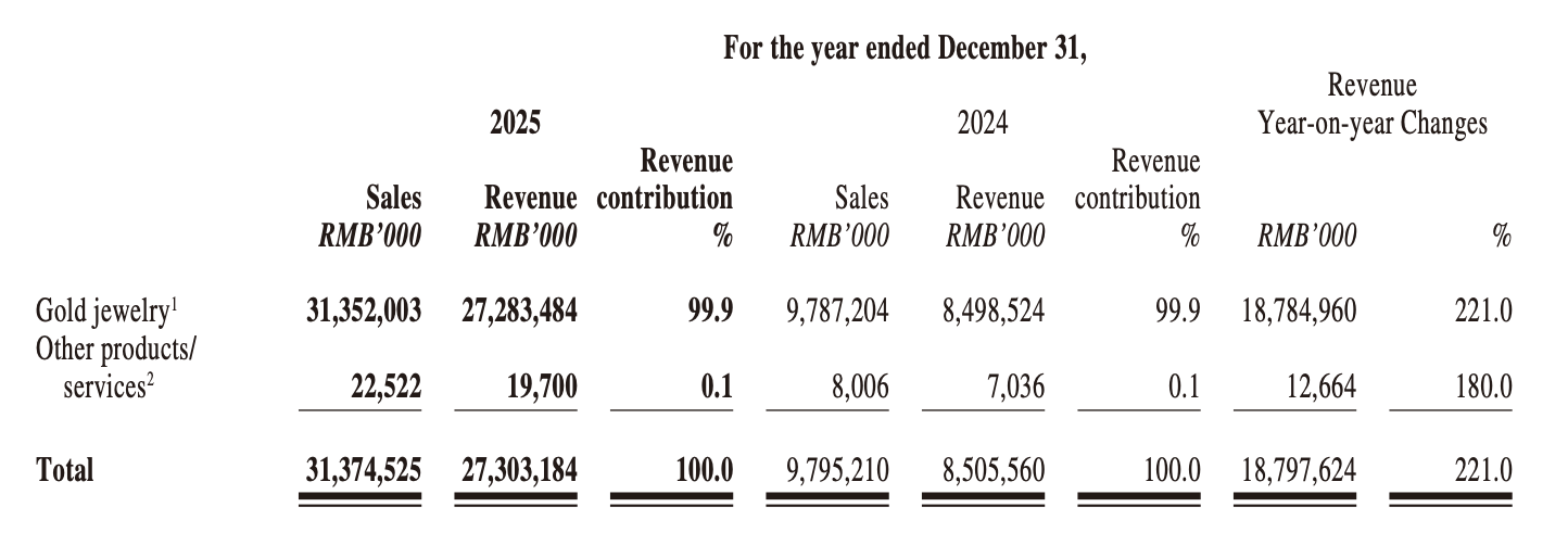 After market close on 23 March, Lao Pu Gold (HK: 6181), positioned as “China’s leading brand in traditional handcrafted gold jewellery”, released its full-year 2025 results, extending its strong explosive growth momentum, with revenue surging 221% year-on-year to RMB 27.303 billion (USD 3.79 billion).