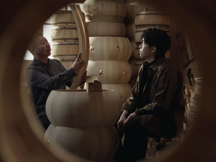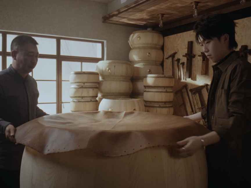 In this collaboration, Wang Chuqin visited Zhang Yong’s drum-making workshop, where he had a hands-on experience with the process of stretching drum skin and tuning drum heads. He also engraved the hulu gourd motif, which symbolizes good fortune and prosperity, onto the drum body.